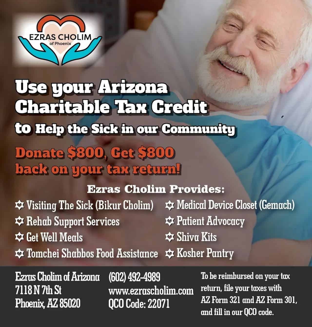 Ezras Cholim (and its projects, the Arizona Kosher Pantry and Tomchei Shabbos) is a 501(c)(3) organization that qualifies for the Charitable Tax Credit. Its QCO code is 22071. To be reimbursed on your tax return, file your taxes with AZ Form 321 and AZ Form 301 and fill in our QCO code 22071.